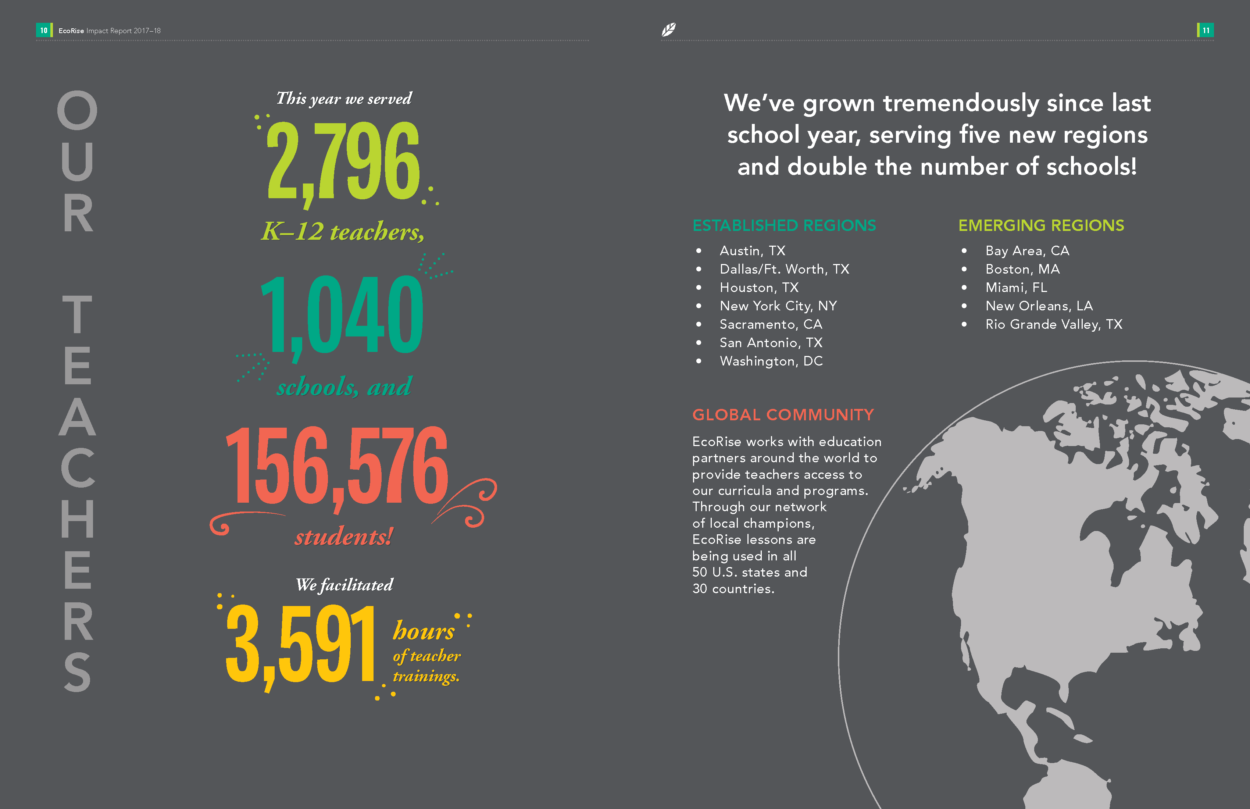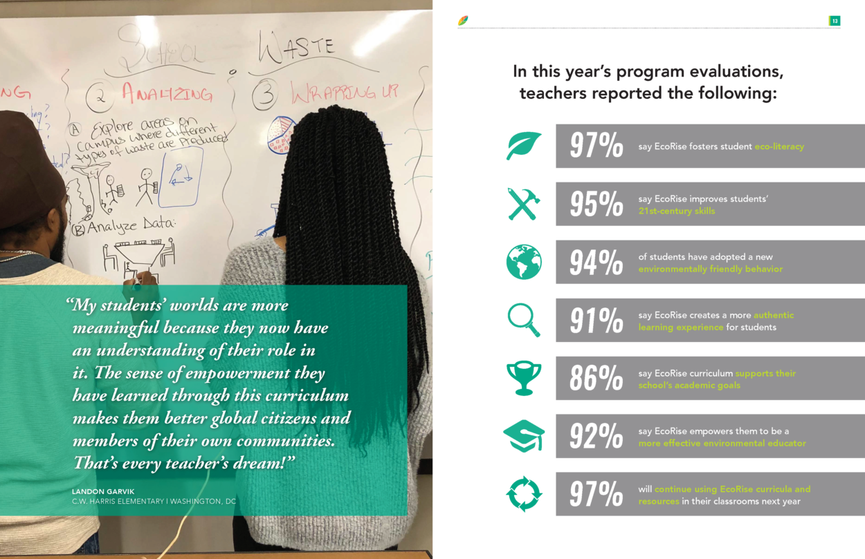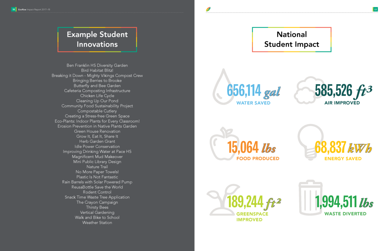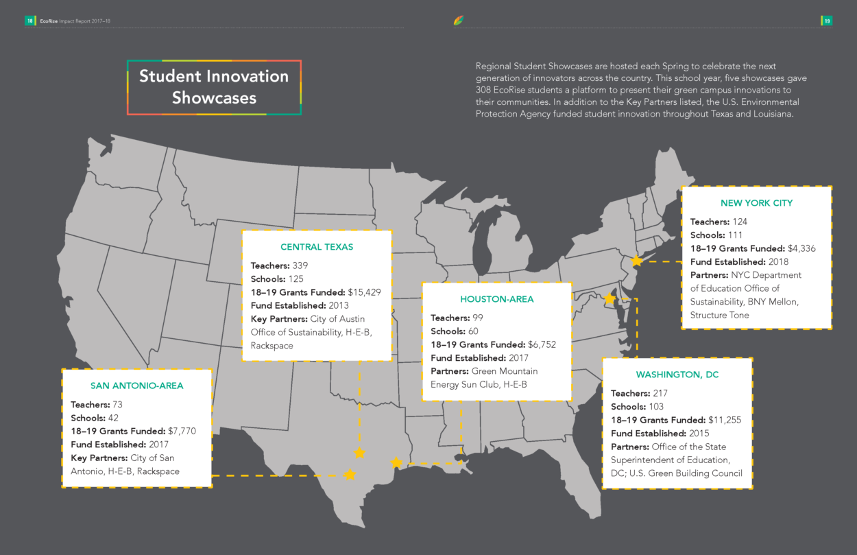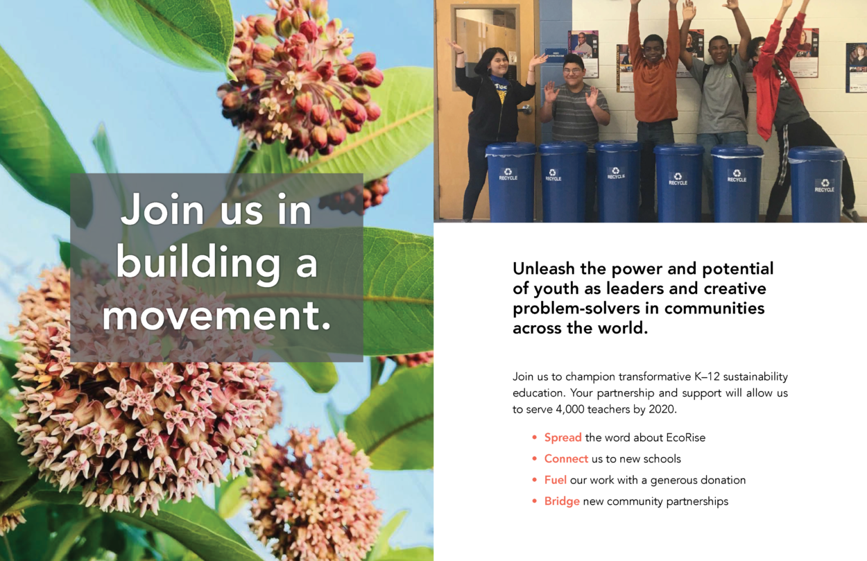 The 2018–19 school year was an enormous year for EcoRise. We are proud to have supported 2,796 K–12 teachers across the country—from New York City to Pharr, Texas—in transforming their classrooms to provide over 156,000 students the opportunity to create real-world solutions to environmental and social challenges in their communities. I am pleased to share our latest Impact Report with you, which highlights some of the major milestones, data points, and stories from the year.