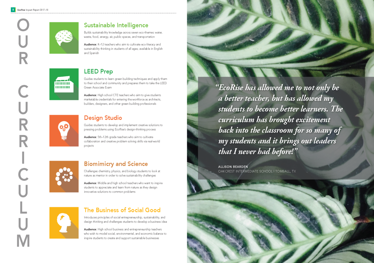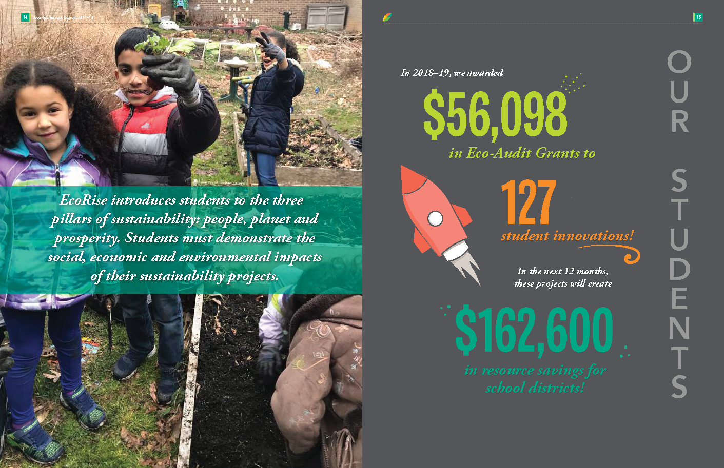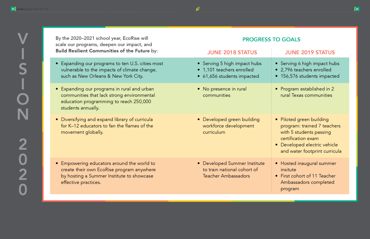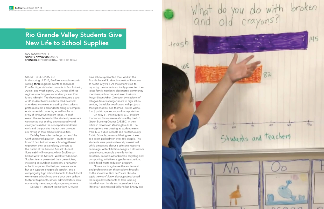 The 2018–19 school year was an enormous year for EcoRise. We are proud to have supported 2,796 K–12 teachers across the country—from New York City to Pharr, Texas—in transforming their classrooms to provide over 156,000 students the opportunity to create real-world solutions to environmental and social challenges in their communities. I am pleased to share our latest Impact Report with you, which highlights some of the major milestones, data points, and stories from the year.